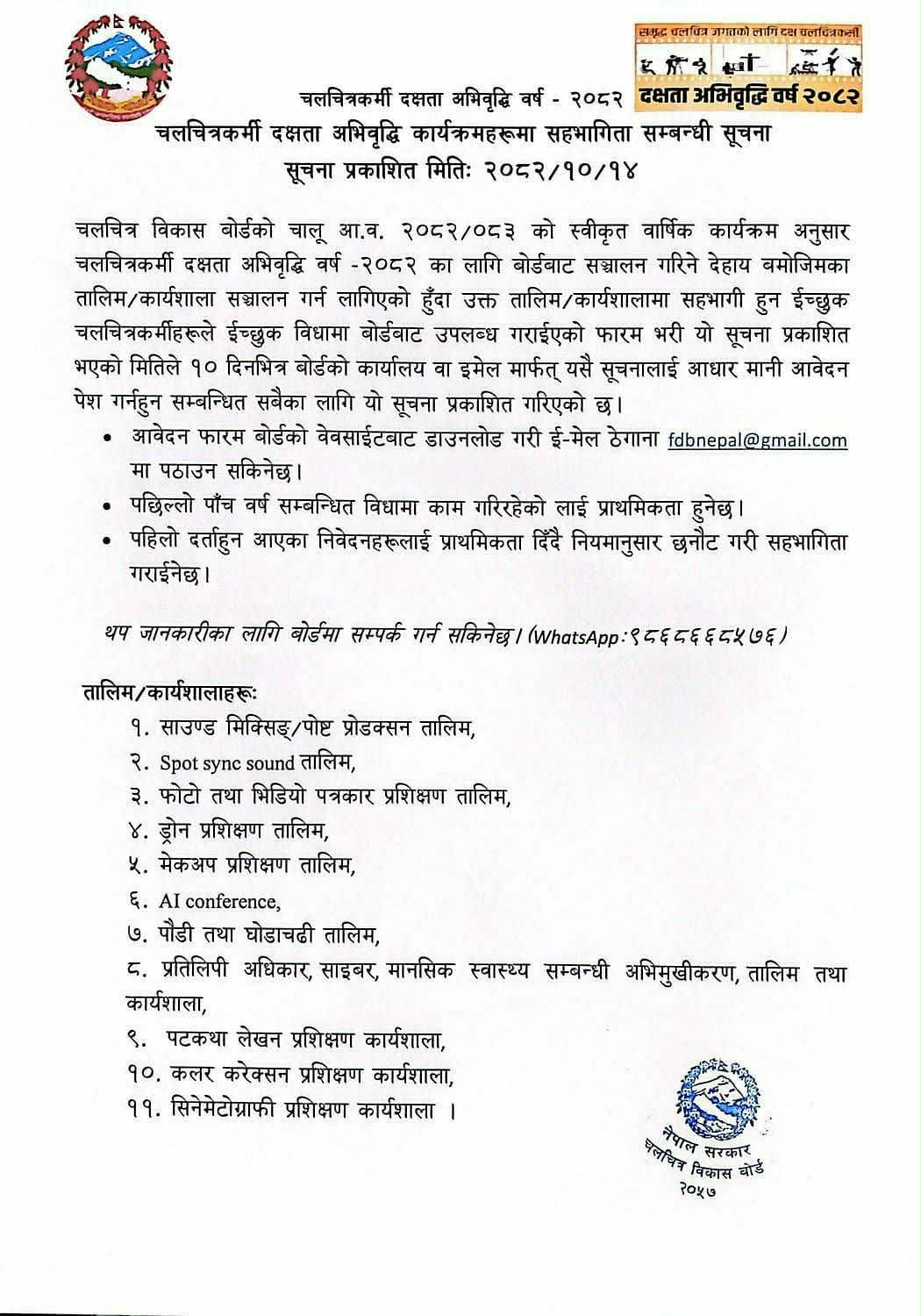 चलचित्र विकास बोर्डले चालु आर्थिक वर्ष २०८२/०८३ अन्तर्गत ‘चलचित्रकर्मी दक्षता अभिवृद्धि वर्ष–२०८२’ का अवसरमा नेपाली चलचित्र क्षेत्रमा कार्यरत चलचित्रकर्मीहरूका लागि विभिन्न ११ विधामा तालिम तथा कार्यशाला सञ्चालन गर्ने गरी आवेदन आह्वान गरेको छ।