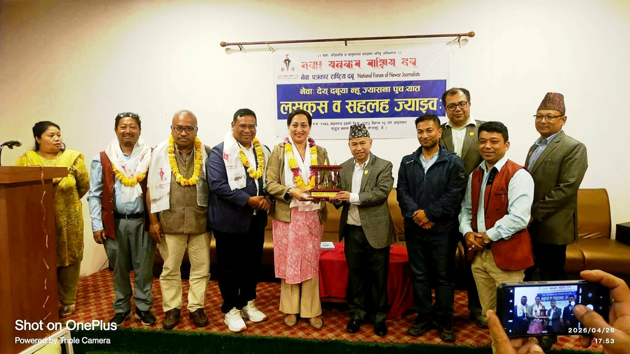 सुनिता महर्जनं न््याकादीगु उगु ज्याझ्वलय् नेवाः पत्रकार राष्ट्रिय दबूया नायः देय् दबूया केन्द्रीय पदाधिकारी व दुजःपिन्त स्वांमाः क्वखायेकादीगु खःसा निर्वचतमान नायः सुरजवीर बज्राचार्यं खादां न्ययेकादीगु व न्वकू सुरेन्द्रभक्त श्रेष्ठं पत्रकार दबूपाखें नकतिनि जक पिथंगु सुरेश किरण ग्रन्थ सफू लःल्हानादीगु खः ।
