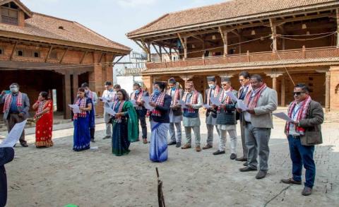 नेवाः कलाकारहरुद्वारा शंखधर साख्वाः अंकित झण्डोत्तोलन