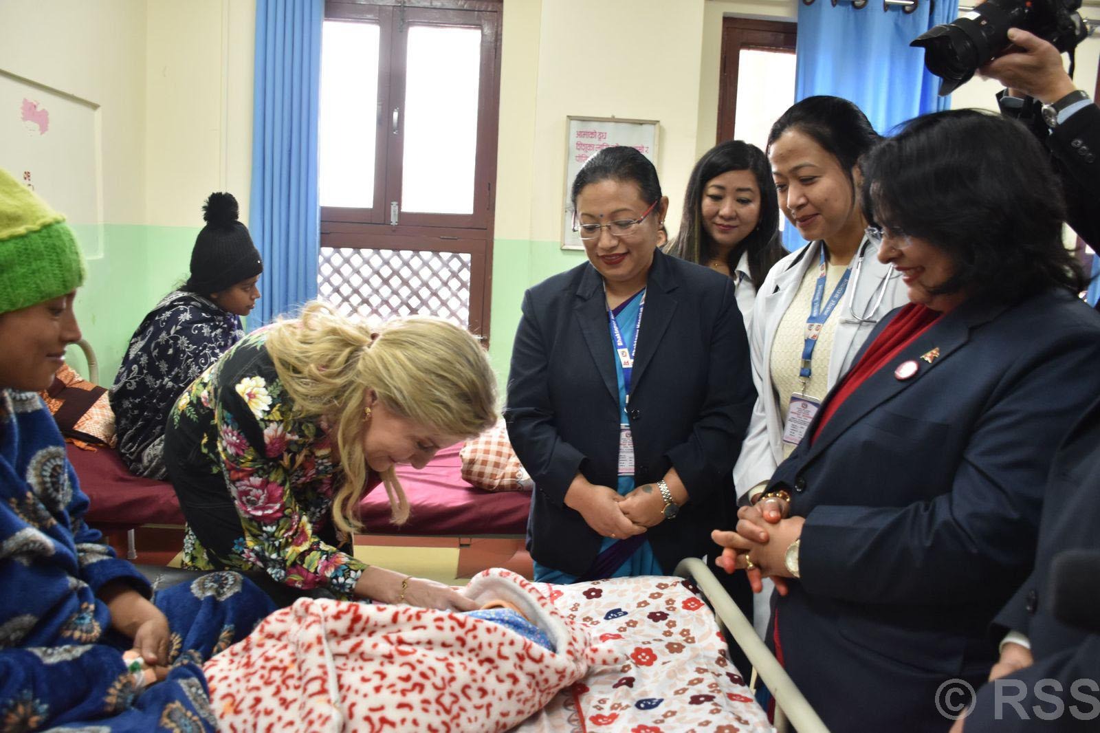 प्रसूति कक्षमा भर्ना भएका नवजात शिशुलाई बोकेर उनले अस्पतालले दिएको सेवा प्रशंसनीय रहेको भन्दै खुसी व्यक्त गरिन् । यौन दुर्व्यवहार र हिंसामा परेका महिलाका बारेमा चासो लिँदै उनले हिंसा पीडित महिलाको व्यवस्थापन, पारिवारिक मिलन, सामाजिक पुनःस्थापनालगायत पक्षका बारेमा छलफल गरेकी थिइन् ।