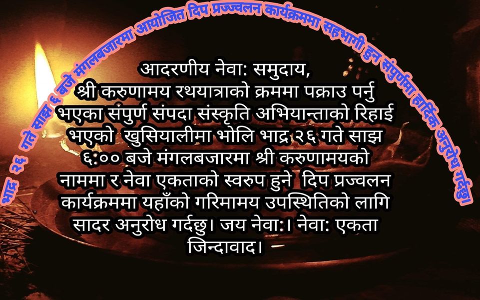 सो दीप प्रज्ज्वलन कार्यक्रममा सम्पूर्ण सम्पदा तथा संस्कृतिप्रेमीका साथै सम्पूर्ण नेवार समुदायको उपस्थितिको लागि हार्दिक अनुरोध पनि गरिएको छ ।