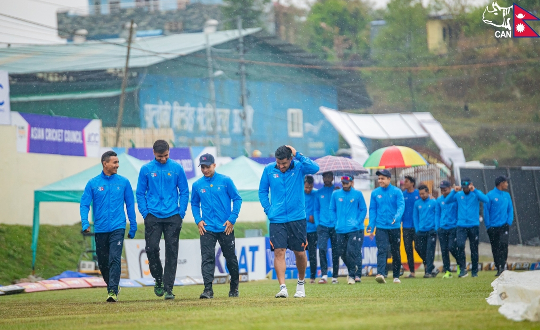 तर, वर्षा नरोकिएपछि खेल हुन सकेन। साढे १० बजे पानी रोकिएपछि मूलपानी क्रिकेट मैदानमा ढाकिएको पिचको कभर हटाइएको थियो। यता, आउट फिल्ड सुपर सापरले सुकाइएको थियो । तर, साढे ११ बजेपछि पुनः पानी पर्न थालेपछि पिच कभरले ढाकिएको थियो ।