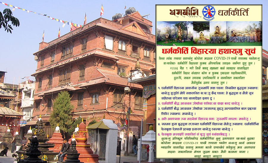 अहिलेको अवस्थामा अत्यन्त जरुरी नभएसम्म विहार पुगी गुरुमांहरुलाई नभेट्न अनुरोध गर्दै बुद्धपूजालगायत धर्मकीर्ति विहारमा हुने अन्य कार्यक्रम विहारको फेसबुक पृष्ठबाट प्रत्यक्ष प्रशारणको व्यवस्था गरिने प्रयास भइरहेको विहारले जनाएको छ ।