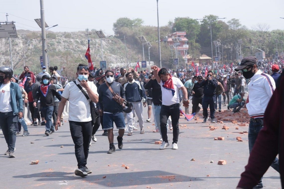 त्यसपछि दुर्गा प्रसाईँ नेतृत्वको भीड तीनकुनेबाट जबरजस्ती अघि बढेपछि प्रदर्शनकारी थप उत्तेजित भएको आचार्यले बताए । प्रहरीले निषेधित क्षेत्रबाट हटाएपछि तीनकुनेको मञ्चबाट दुर्गा प्रसाईँ र रवीन्द्र मिश्रले संसद् भवन, सिंहदरबार र विमानस्थल कब्जा गर्न माइकिङ गर्दै निर्देशन दिएको र प्रदर्शनकारी तोडफोडमा उत्रिएको प्रवक्ता आचार्यले बताए ।