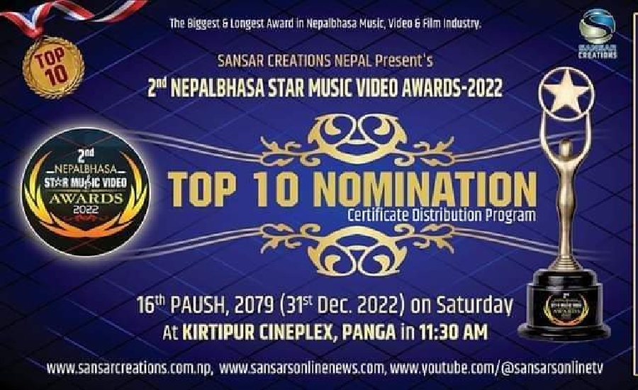 नेपालभाषाको गीत - संगीत र चलचित्र क्षेत्रकै सबैभन्दा ठुलो पुरस्कार समारोह भनेर दाबी गरिएको नेपालभाषा स्टार म्यूजिक भिडियो अवार्ड्सको दोश्रो संस्करणको पुरस्कारको प्रतिस्पर्धामा रहेकाहरुको मनोनयन विभिन्न सामाजिक सन्जाल मार्फत सार्वजनिक नभइसकेको छ भने शनिबार किर्तिपुर सिनेप्लेक्समा मनोनयनमा परेका हरुलाई प्रमाण पत्र गरिने भएको छ