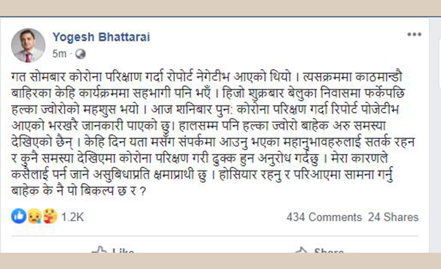 उनले फेसबुक मार्फत आफुलाई कोरोना संक्रमण पुष्टि भएको जानकारी दिँदै केही दिन यता सम्पर्कमा आएका सबैलाई सतर्क रहन आग्रह गरेका छन् ।