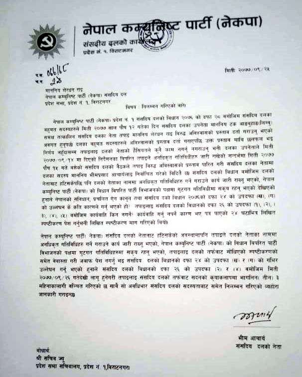प्रचण्ड–नेपाल समूहका संसदीय दलका नेता भीम आचार्यले हस्ताक्षर गरेको पत्रमा दलको बैठकमा सहभागी नभएको, पार्टी हित विपरीत गतिविधि गरेको भन्दै कारबाही गरिएको उल्लेख छ ।