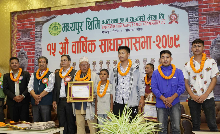 भक्तपुरको मध्यपुर थिमि बचत तथा ऋण सहकारी संस्थाले सांस्कृतिक क्षेत्रमा योगदान दिएका ७ वटा समूहलाई सम्मान गरेको छ । संस्थाको १५ औं वार्षिक साधारणसभा कार्यक्रममा ऐतिहासिक निलबाराही गण प्याखँ मध्यपुर बोडे, लायकू भैलः सञ्चालन समिति, महाकाली प्याखँ व्यवस्थापन समिति दिगुटोल, थिमि गुंला बाजा खलः बज्राचार्य समुदाय, मध्यपुर थिमि गुंला बाजा प्रजापति समुदाय,  येँयाः पुन्हिया लसताय् म्ये प्वाः खानीगु जात्रा व्यवस्थापन समिति तथा मानन्धर गुंला बाजा सिवा साय्मि खलःलाई सम्मान गरेको हो । मध्यपुर क्षेत्रकै गौरव गर्न लायकको संस्कृतिलाई विकास, संरक्षण र प्रवद्र्धनमा टेवा दिएकोलाई मूल्यांकन गरी वाग्मती प्रदेशका खानेपानी, ऊर्जा तथा सिंचाइ मन्त्री माननीय श्री बसन्त मानन्धरले दोसल्ला ओडाएर फूलमालासहितको कदर–पत्र हस्तान्तरण गरी सम्मान गरेका हुन् । कार्यक्रममा सुरेश श्रेष्ठ तथा समीर कारंजितलाई सदस्य प्रोत्साहन पुरस्कार दिइएको छ ।