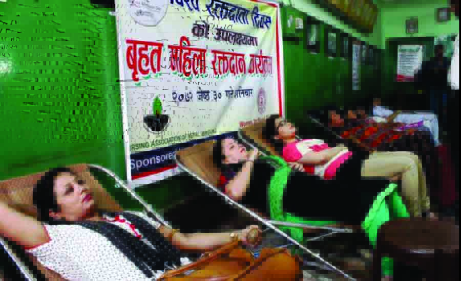 नेपालमा अझै महिला रक्तदाताको सङ्ख्या न्यून रहेको छ । ‘रक्तदान गर्दा कमजोर भइन्छ’ भन्ने मानसिकताले पुरुषको तुलनामा महिला रक्तदाताको सङ्ख्यामा सुधार हुन नसकेको हो । रक्तसञ्चार सेवा केन्द्रले आव २०७५÷७६ मा ५५ हजार ९५३ युनिट रगत सङ्कलन गरेकोमा ४६ हजार ४०५ युनिट पुरुषको र नौ हजार ५४८ युनिट महिलाको थियो । सङ्कलित कूल रगतमध्ये महिलाको रगत १७ दशमलव ०७ प्रतिशत हो । केन्द्रका प्रमुख डा मनिता राजकर्णिकार रक्तदानबारे महिलाको बुझाइमा सुधार हुँदै गएको बताउनुहुन्छ । “सचेतनाका कार्यक्रम थप विस्तार गर्नुपर्छ”, उहाँको सुझाव छ । देशभर सङ्कलन गरेको रगत र रक्ततत्वमध्ये महिला रक्तदाताको सङ्ख्या १६ प्रतिशत पुगेको छ । नेपालभर दुई लाख ७१ हजार ९२२ युनिट रगत सङ्कलन गरी तीन लाख ४५ हजार १५१ रक्ततत्व वितरण भएको थियो । नेपाल रेडक्रस सोसाइटीद्वारा सञ्चालित केन्द्र हाल ७३ जिल्लाका १०८ स्थानमा छ । सङ्कलित रगतमा एचआइभी, हेपाटाइटिस बी, सी र सिफलिस जीवाणु भेटिनेक्रम घट्दो रहेको केन्द्रले जनाएको छ । गत वर्ष सङ्कलित रगतमध्ये एचआइभी ११३, हेपाटाइटिस बी ७००, सी ४२४ र सिफलिस १२२० जीवाणु भेटिएको थियो । “रक्तसञ्चार सेवा केन्द्रबाट सङकलन गरिएका सबै रगतमा ती जीवाणु भेटिने क्रम कम हुँदै गएको छ”, प्रमुख डा राजकर्णिकार बताउनुहुन्छ । विसं २०२३ साउन १२ गतेदेखि केन्द्र सञ्चालनमा आएको हो । पहिलो वर्ष १५७ युनिट रगत सङ्कलन भएको थियो । शुरुमा पेशेवर व्यक्तिबाट रगत सङ्कलन गरी वितरण हुने गरेको थियो । विसं २०३९ देखि रगत किनबेच अन्त्य गरी स्वयंसेवी रक्तदाताबाट रगत सङ्कलन कार्य हुँदै आएको छ । गोर्खा भूकम्पले प्रदर्शनी मार्गस्थित केन्द्रको भवन पूर्ण क्षति भएपछि सोही स्थानमा अत्याधुनिक भवन निर्माण कार्य जारी रहेको छ । हाल बालकुमारीस्थित आकस्मिक रक्तसञ्चार भवन र नेपाल रेडक्रसको केन्द्रीय कार्यालय ताहाचलबाट सेवा प्रदान भइराखेको छ । रगतको बढ्दो मागलाई ध्यानमा दिई ठूला अस्पताल, मेडिकल कलेज तथा स्वास्थ्य विज्ञान प्रतिष्ठानले आफ्नै रक्तसञ्चार सेवा सञ्चालनमा ल्याएका छन् । क्यान्सर, आकस्मिक दुर्घटना, प्रसूति तथा हेमोफिलियाका रोगीका लागि बढी रगत र रगतको तत्व आवश्यक पर्दछ ।