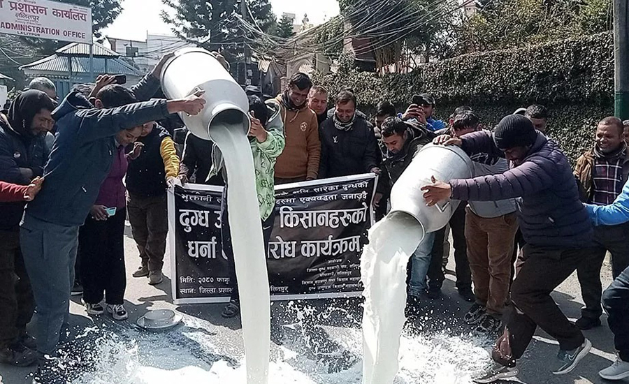 ललितपुरका किसानले पनि गरे दूध पोखेर प्रदर्शन