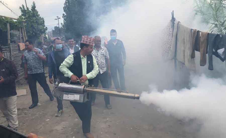 भक्तपुरमा डेङ्गु रोगको प्रकोप फैलिएपछि प्रतिनिधिसभाका सांसद एवं पूर्वमन्त्री महेश बस्नेत डेङ्गु नियन्त्रणका लागि लामखुट्टे मार्ने औषधिसहितको गन बोकेर बस्ती छिर्नुभएको छ ।