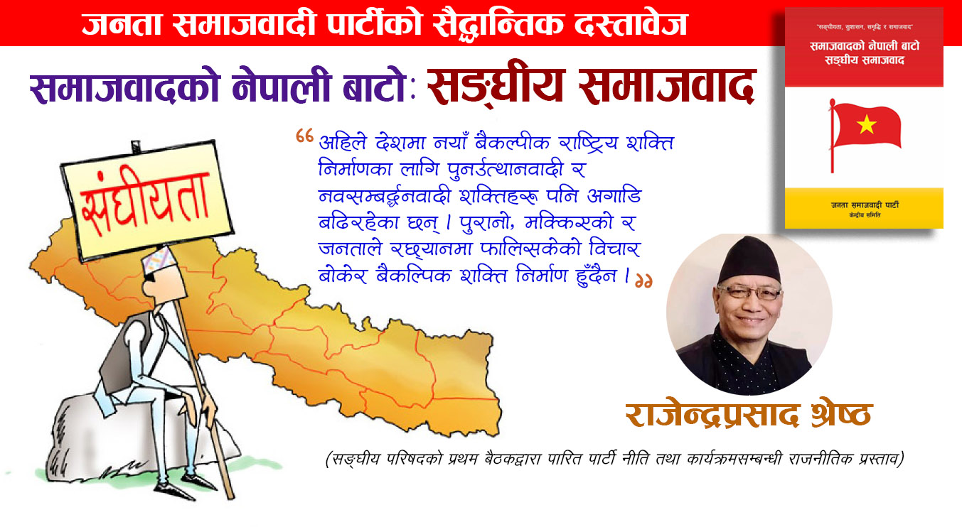 समाजवाद विश्व पुँजीवादको वैकल्पिक ब्यवस्था हो । आजको युगमा समाजवादको एक मात्र बाटो छैन । प्रत्येक देशका निम्ति समाजवादको आफ्नै बाटो हुनु पर्दछ । आफ्नो देशको सामाजिक चरित्र जस्तो छ, परिवर्तनको समाजवादी बाटो पनि त्यसअनुरूप नै हुनु पर्दछ । स्क्यान्डेनेभिया, चीन, हिन्दचीन, ल्याटिन अमेरिकाका मुलुकहरूमा आफ्नो मौलिक विशेषतामा आधारित समाजवाद स्थापना गर्ने कार्य भइरहेको छ । तिनीहरूको सफलताले विश्वभरिकै समाजवादीहरूलाई प्रेरणा मिलेको छ । उन्नाइसौँ शताव्दीको चौथो दशकमा काल्पनिक समाजवादको स्थान आधुनिक समाजवादले लिएदेखि आजसम्म आइपुग्दा यसका विविध प्रारूपहरू विकसित भएका छन् । आधुनिक समाजवाद मुलतः पश्चिम युरोपका राष्ट्रिय राज्यहरूमा विकसित भयो, जहाँ सन् १८४८ को क्रान्तिपश्चात एक जाति एक देशको मान्यताका आधारमा देशका सीमाहरू पुनर्संरचना भए । त्यसैले बहुजातीय देशका समस्याहरूलाई यसले सम्बोधन गर्न सकेको छैन । त्यसैले हामीले बहुराष्ट्रिय राज्य सुुहाउँदो समाजवादको मौलिक बाटो विकास गर्नु पर्दछ । सङ्घीय शासन प्रणालीसहितको समाजवाद हाम्रो मौलिक बाटो हो । यस्तो व्यवस्थामा सङ्घीयता देशका उत्पीडित राष्ट्रियताहरूमाथि भइरहेको विभेद मुक्तिको आधार हो भने समाजवाद श्रमजीवी वर्गको मुक्तिको आधार हो । सङ्घीय शासन प्रणाली यसको रूप हो र समाजवादी सामाजिक–आर्थिक व्यवस्था सार हो । यसले राष्ट्रिय मुक्ति आन्दोलन र समाजवादी आन्दोलनलाई एक साथ अगाडि बढाउने छ र नेपाललाई एकाइसौँ शताव्दीको समृद्ध सङ्घीय समाजवादी मुलुकमा परिणत गर्ने हाम्रो ऐतिहासिक अभिभारालाई पूरा गर्ने छ ।