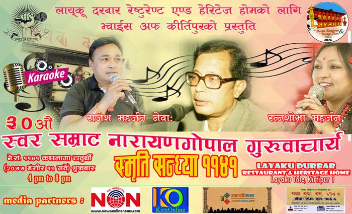 लायकू दरबार एण्ड हेरिटेज होमको लागि भ्वाईस अफ कीर्तिपुरले आयोजना गर्न लागेको सो स्मृति सन्ध्यामा राजेश महर्जन नेवाः र रत्नशोभा महर्जनले स्वर सम्राट नारायणगोपालका गीतहरु प्रस्तुत गर्नेछन् । यीबाहेक सो सांगीतिक कार्यक्रममा कीर्तिपुरका अन्य कलाकारहरुको पनि सहभागिता रहने जनाइएको छ ।